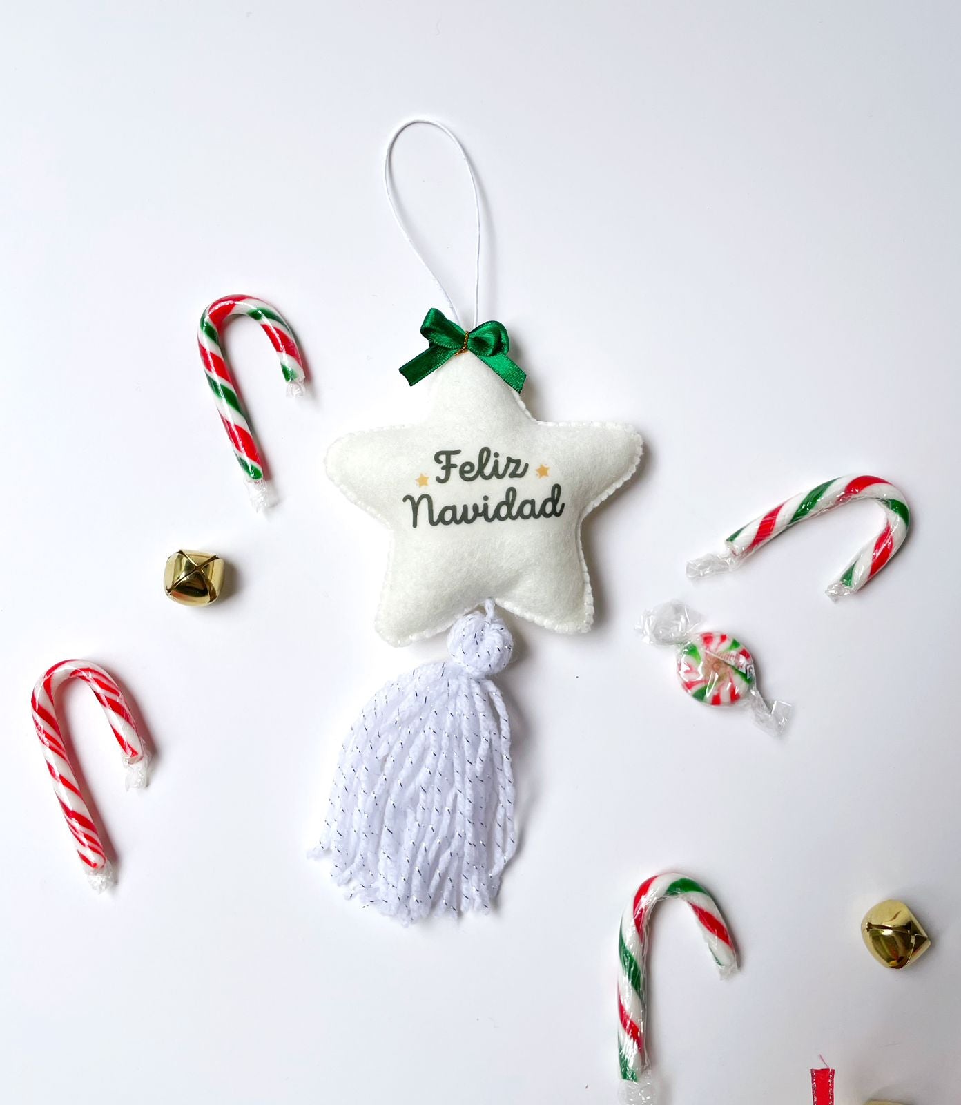 Estrella en fieltro frase “Feliz Navidad”, con opción de frase o nombre personalizada. Pedido mínimo para personalización: 3 unidades. ¡Decora tu árbol o regálala a alguien especial!